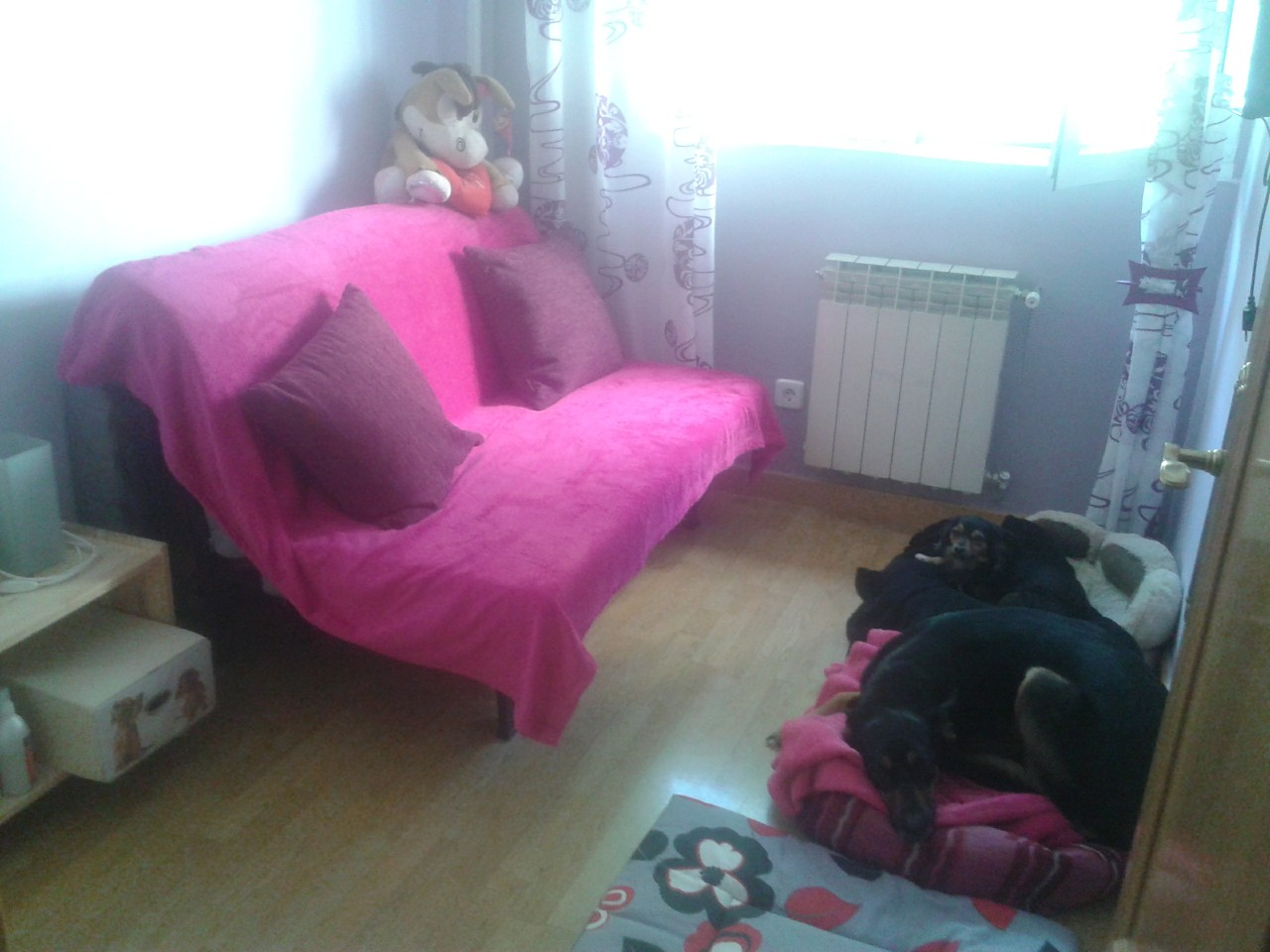 Dos habitaciones con mucha luz con sus cunitas y mantitas con calefaccion en invierno, salon espacioso donde se puede echar sus siestas. Terraza de 40 m2 con cesped artificial y juguetes para ellos. Y todo ello sin puertas cerradas.